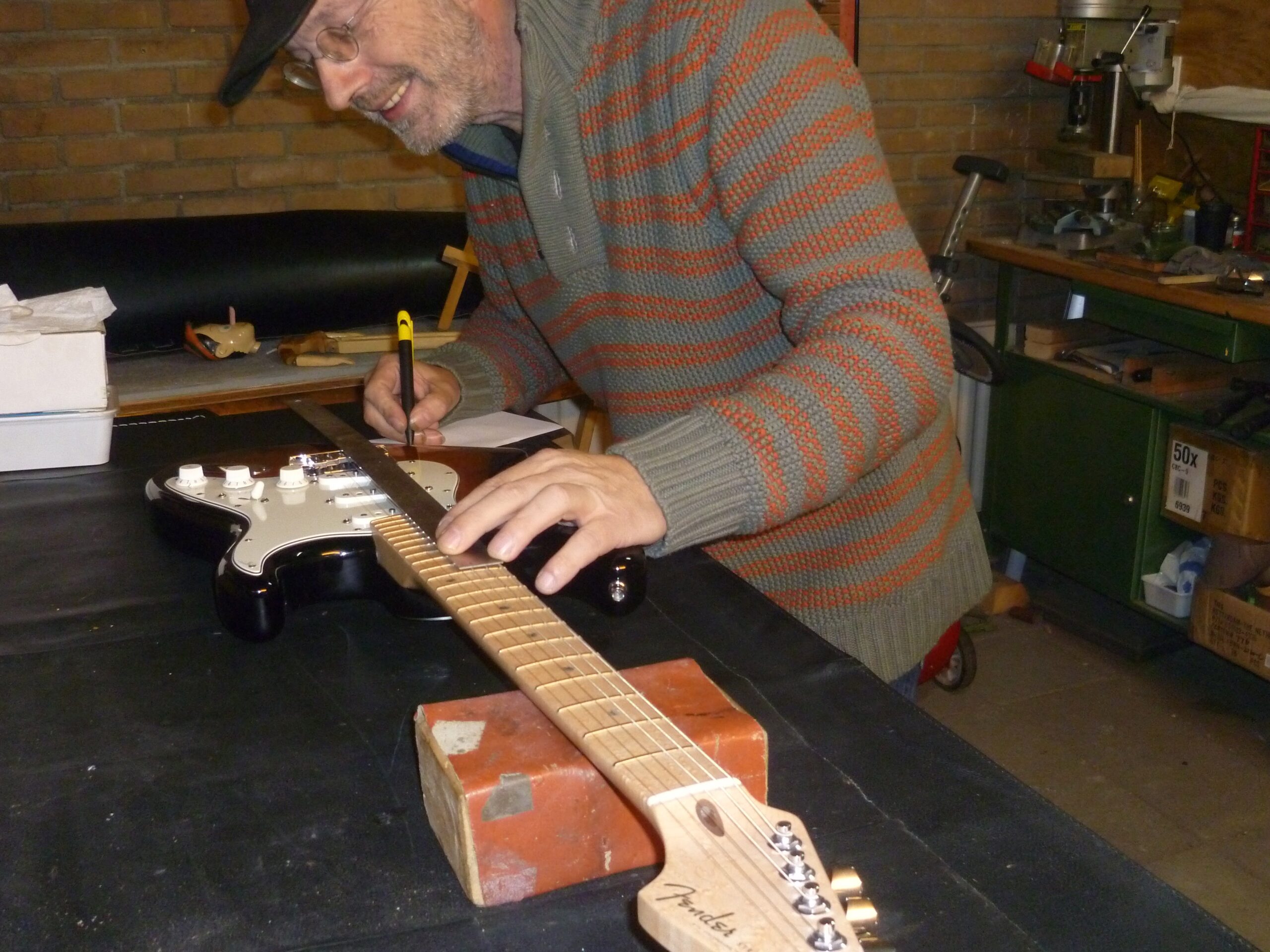 Hallo gitaarvrienden. Donderdags geef ik nog altijd gitaarles. Ik ben al met dat gitaarles geven begonnen toen ik nog bij m’n vader en moeder thuis woonde. Op m’n 24e, ging ik de deur uit om met m’n grote liefde samen te gaan wonen. Ik verdiende toen al twee jaar de kost met muziekoptredens, maar ook in die periode ben ik altijd les blijven geven. Alleen gingen de optredens wel altijd voor, maar dat wisten m’n leerlingen. Door dat lessen blijf ik zelf ook scherp en up to date. Ik doe het nog steeds graag. Toch heb ik vandaag ook nog tijd gehad om wat dingetjes in de werkplaats te doen. Een van de dingen was een intonatie-schroefje vervangen van een Gibson Tune ‘o-matic brug. Je weet wel een van de schroefjes die het metalen zadeltje verstelt, waarover de snaar loopt. Meestal zijn deze verstelbaar met een sleufkop, of met ’n kruiskop schroevendraaier. Deze niet. Op dit exemplaar kon het zadeltje alleen versteld worden met ’n inbus-sleuteltje van 3,2 mm. Helaas had in het verleden iemand een van de schroefjes geforceerd en kon daardoor niet meer versteld worden. Het ziet er simpel uit. Even ’n ander schroefje erin doen en klaar. Nou, eh nee dus. Probeer maar eens aan precies zo’n schroefje te komen. Dat zal niet gemakkelijk worden. Daarom heb ik een inbus-schroefje van 20 mm ingekort naar 12 mm lengte en daarnaast de schroef ook moeten voorzien van een cylindrisch uiteindje van 2 mm rond. Dat eindje houdt het schroefje op z’n plaats in het frame van de Tune ‘o-matic brug en daarmee dus ook het zadeltje.