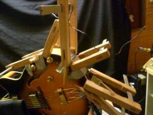 Dus ik ga vandaag weer lekker aan een gitaar beginnen. Het is met al mijn 40 jaar ervaring wel routine, maar het blijft ook nieuw, omdat het altijd toch net weer even anders is. Het mooiste werk vind ik persoonlijk om een matig klinkende gitaar zo te kunnen tunen, dat hij ’n klasse geluid gaat produceren. En dan niet dat je goed moet luisteren om het verschil te kunnen horen, maar een overduidelijke klankverbetering. Daar word ik pas echt blij van en de vrienden waarvoor ik het doe ook. Soms zijn de resultaten van klankverbetering ongelooflijk. En het zijn ook lang niet altijd de duurste instrumenten die zo goed gaan klinken. Ik ben nu ook weer met een Australische akoestische gitaar bezig, die toch wel erg matig klonk. Dof hoog vooral en enigszins gedempt. Dan ga ik met een endoscope (mini-camera aan een slangetje) aan de binnenkant kijken. Bij inspectie bleken de balken veel te zwaar. Voor een fabriek is dat lekker safe met weinig kans op klachten, maar zulke dikke balken kunnen het geluid helaas alleen maar dempen. Daar werk ik dan aan. Wat schaaf- en snijwerk, of juist een overbruggingsbalkje aanbrengen en steeds tussendoor de sterkte testen en ook de flexibiliteit van het bovenblad.